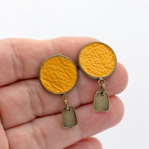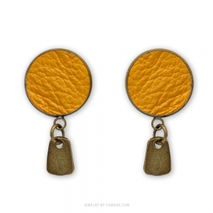 Antique bronze plated earring studs with honey yellow leather discs