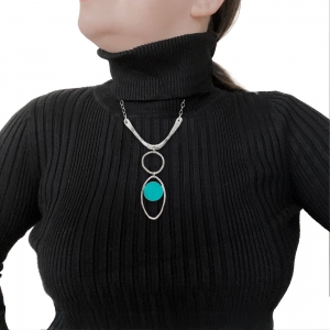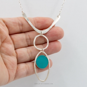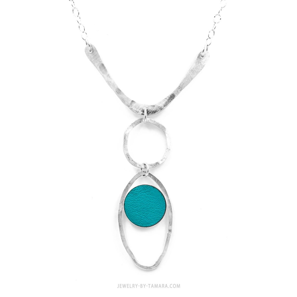 Sterling silver necklace with a turquoise leather circle in a sterling silver bezel setting