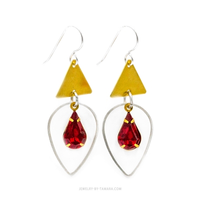 Red Swarovski crystals antique silver and brass earrings