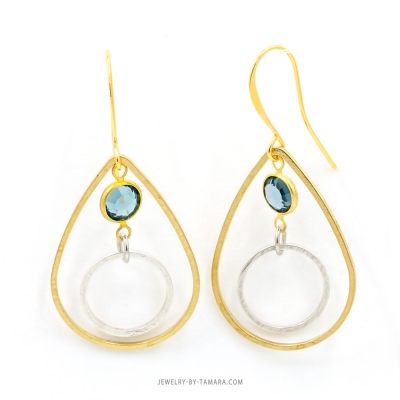 Blue Swarovski crystals, brass teardrop and silver circle earrings